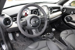 My Cooper S coupe tester had the sport package, which brings upsized wheels and tires and a stiffer suspension, that proved jarring over my hometown’s poor roads. (I talked to a Mini salesman at my local dealer who says he actually tries to talk buyers out of the sport package, because of that detriment to ride quality.) Road noise is pretty serious too, and the upsized wheels and tires clomp and clunk over imperfect pavement.