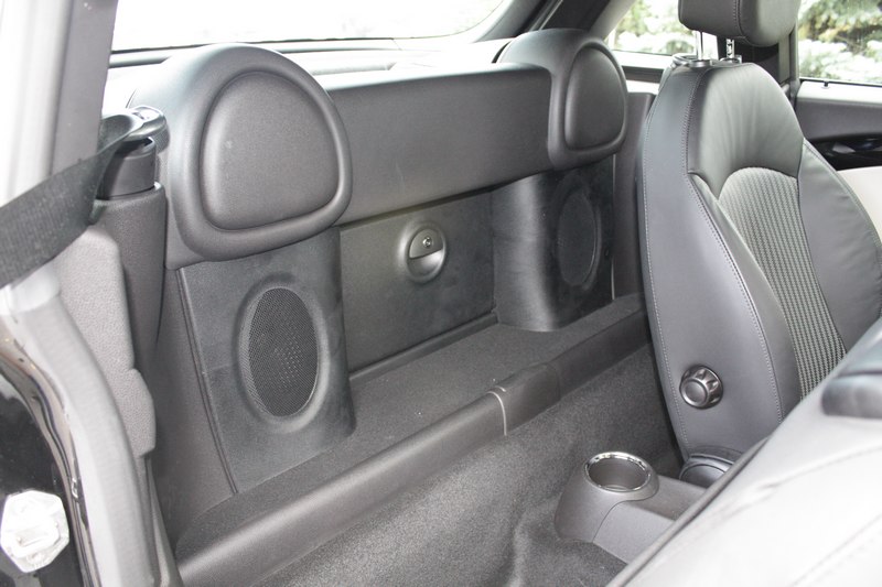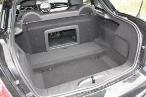 The coupe’s cargo area is larger than what’s behind the rear seat in the original Cooper, with the obvious caveat that it’s all you get without a back seat to fold away. The passenger compartment and trunk are separated by a rigid divider with a pass-through for long items. There’s a decent amount of storage for small stuff behind the seats; a couple of small grocery bags will fit on a ledge at elbow height. If you’re short and don’t need the seat pushed all the way back, you’ll find a narrow slot for stuff there, too. A two-piece cargo cover – one part goes up with the tailgate, while the other stays put – provide some security; the cover in my tester rattled constantly over rough roads.